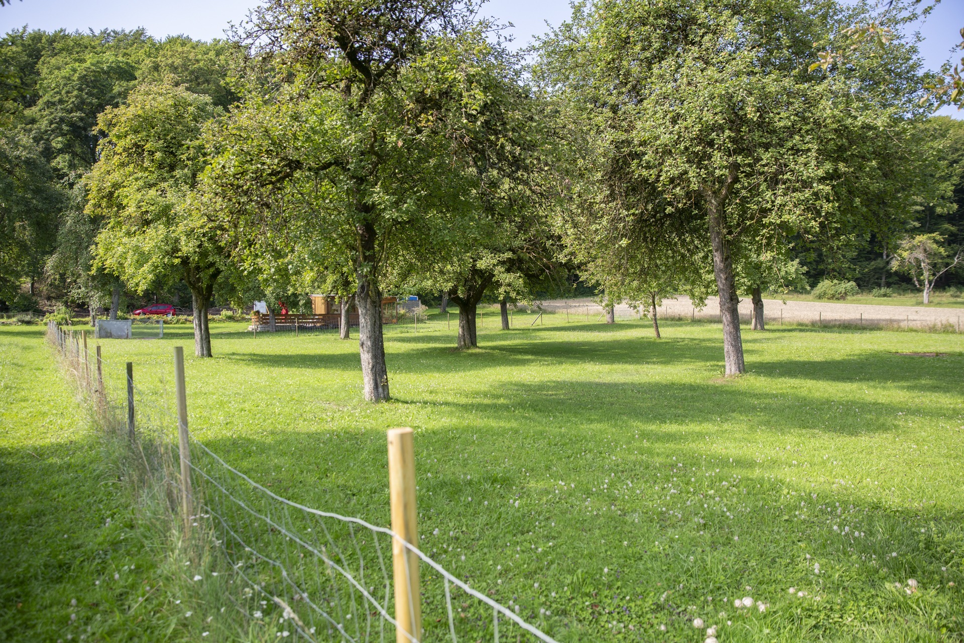 • Das Grundstück vor dem Wald gehört der Stadt, der Wald selbst dem Land – bitte respektieren.